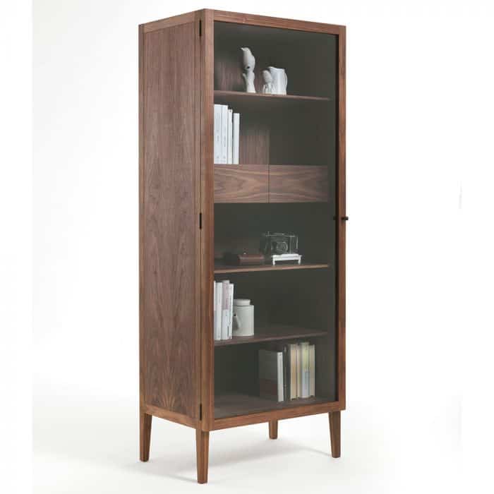 Die Vitrine „Light small“ von RIVA mit schmalen Füßen verfügt über eine Tür aus transparentem Kristallglas