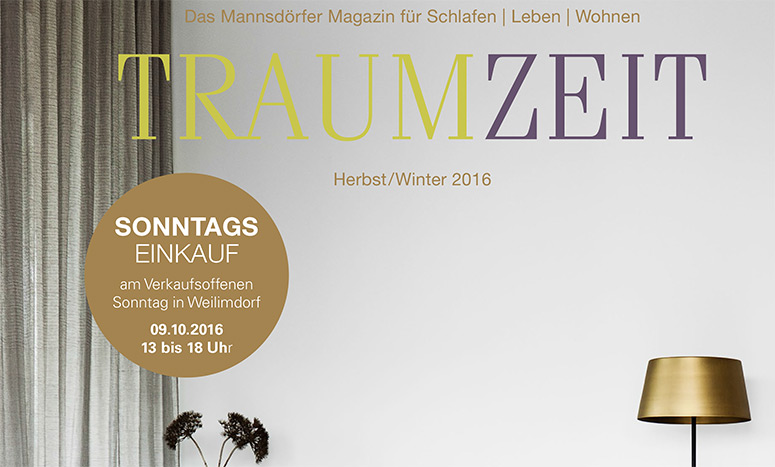 Starten Sie mit uns in den Herbst/WInter 2016 und lassen Sie sich von unserem TRAUMZEIT Magazin inspirieren. Besuchen Sie uns, wir haben viele Angebote und Aktionen für Sie vorbereitet. Am Sonntag, 09. Oktober 2016 haben wir im Rahmen des "Weilemer Herbst" mit seiner Schlemmertour von 13 bis 18 Uhr für Sie geöffnet.