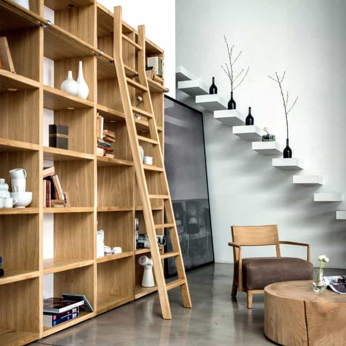 Das Bücherregal „Wallstreet“ aus Massiv- und Furnierschichtholz ist vielfältig konfigurierbar und lässt sich durch Rückwände, Türen und Schubladen beliebig erweitern. Die wunderschöne Sprossenleiter aus Massivholz ist zusätzlich erhältlich und ein toller Blickfang.